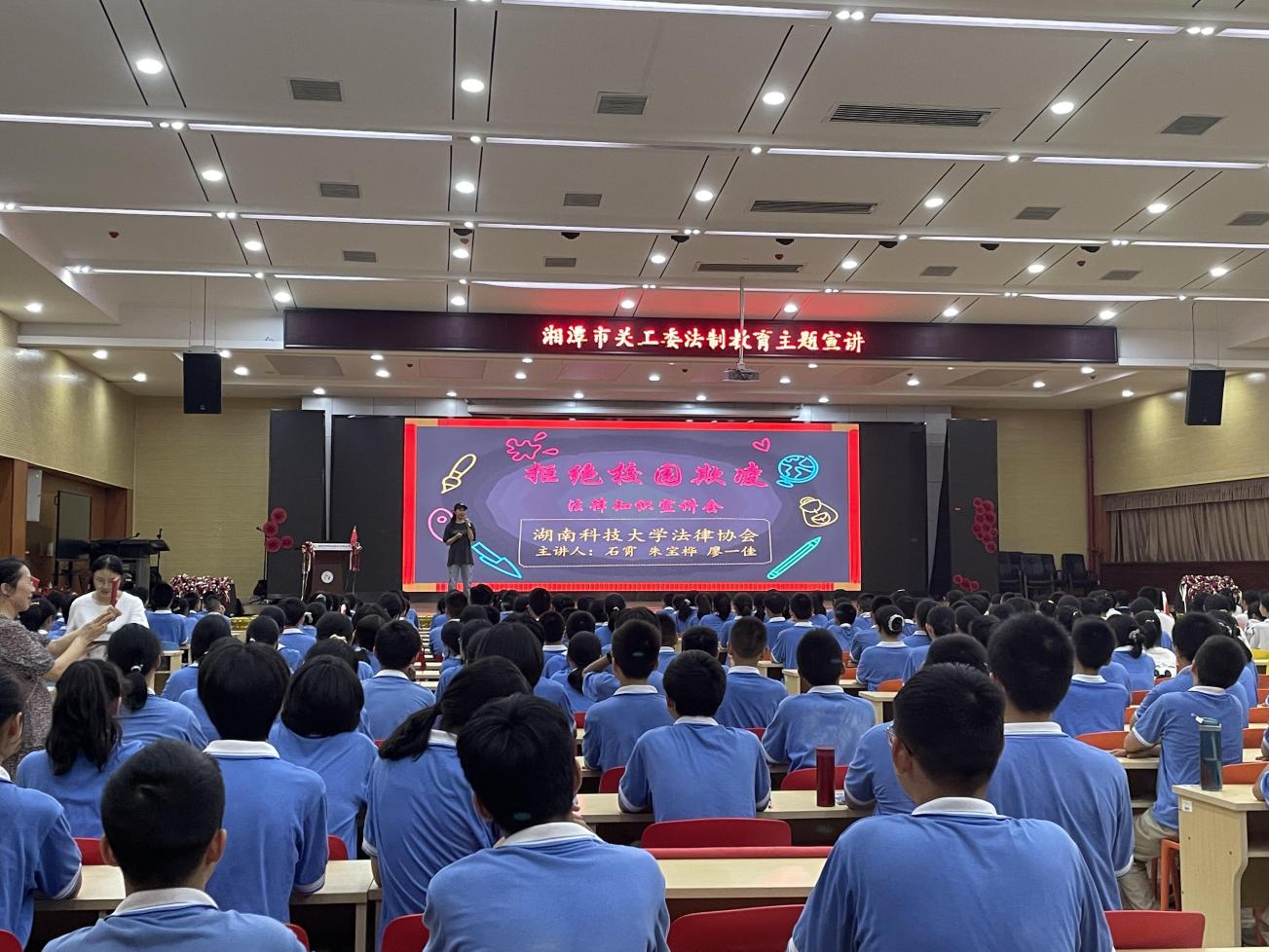法律协会再次应邀在湘潭市示范性综合实践基地进行了以“拒绝校园欺凌”为主题的普法宣讲。教育基地的近500余名学生、部分老师参加了此次宣讲活动。