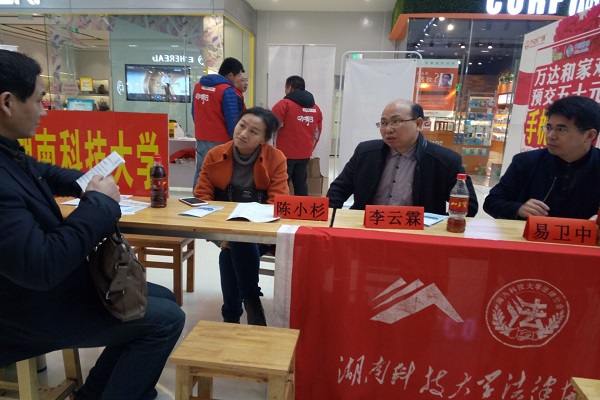 伍安辅导员和易卫中、李云霖、陈小杉、黄素梅老师莅临现场,指导同学们开展法制宣传和咨询工作。 3月15日上午9时,法律援助中心和法律协会成员准时来到万达广场,进行消费知识的宣传以及法律问题的解答。同学们分发法援宣传单,并热心为前来咨询的群众做好引导。同时,色情动漫
