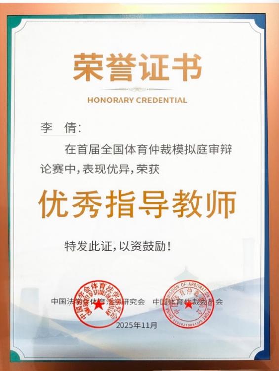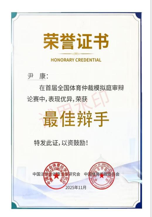 作为贯彻落实新修订《体育法》中体育仲裁制度的重要实践,本次比赛全程模拟真实体育仲裁庭审程序,涵盖申请人陈述、被申请人答辩、举证质证、庭审辩论及总结陈述等多个环节,全面考察选手的法律知识储备、逻辑思辨能力及庭审应变水平。在16进8比赛中,我校代表队迎战强队中山大学,最终我方凭借对案涉参赛资格争议的专业分析、冷静睿智的控场表现和论证严谨的辩论思路获得仲裁庭一致认可,顺利晋级。在1/4决赛中,队员们面对复杂的足球协会纪律处罚争议,沉着拆解争议焦点,精准把控庭审节奏,展现了突出的法律思维能力与庭辩实战能力。仲裁庭也对我校队员专业的法律思维、迅捷的反应能力、优雅大气的庭辩素养给予了非常高的评价。尽管在局面占优的情况下因客观因素遗憾止步四强赛,但队员们的出色表现充分彰显了我校法学教育的扎实成效与我校学生出色的专业综合素质。