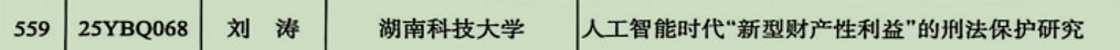 刘涛博士的《人工智能时代“新型财产性利益”的刑法保护研究》,该项目基于人工智能时代背景,探究“新型财产性利益”的生成与刑法保护问题。