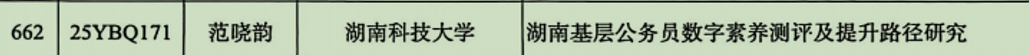 范晓韵博士的《湖南基层公务员数字素养测评及提升路径研究》,项目聚焦湖南基层公务员数字素养多维测评,并在此基础上提出提升路径,以期为湖南数字基层政府建设提供智力支持。