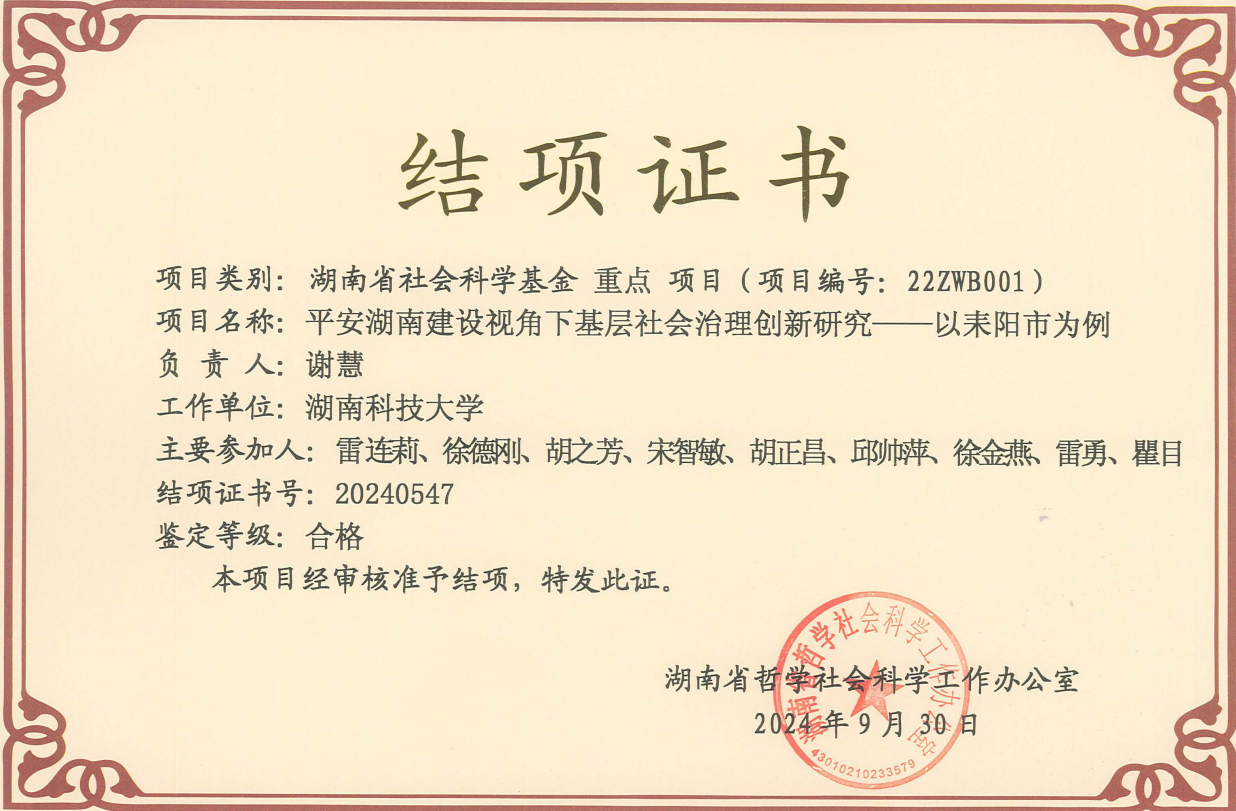 近日,法管理学院承担的《平安湖南建设视角下湖南基层社会治理创新研究——以耒阳市为例》省社会科学基金智库重点项目成功通过验收,完成结题。该项目由校党委副书记谢慧主持,色情动漫