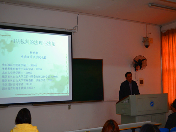 邀请,在九教508教室进行关于“司法制裁的法理与法条”的专题讲座。副院长喻军、法学系系主任刘铁光及吴四江、雷连莉等老师出席,2011级和2012级法学专业学生到场学习。 杨教授以法律与社会的关系为切入点,分别从 “ 法律来源于社会生活 ” 、 “ 社会冲突与司法救济 ” 、 “ 司法裁判的法理与法条 ” 三个大方面进行了阐述,特别是对如何运用法理理解法条以及如何运用法理和法条解决实务问题作了详尽而全面的解读。讲座中杨老师以生动的案例、幽默的语言和严谨的分析赢得阵阵掌声。 最后,喻军老师对本次讲座进行了总结,他高度评价杨老师的讲座,并要求同学们在学习中一方面加强法理知识的学习,另一方面对法条的理解应建立对在法理深入理解的基础上只有将二者有机结合,才能做到对法条的正确运用。 新闻链接: 杨开湘,男,1968年10月出生,湖南溆浦人。华东政法学院法学硕士(1994),奥地利维也纳大学访问学者(1999-2000),北京大学法学博士(2005),德国柏林自由大学艾伯特基金高级访问学者(2008),德国柏林自由大学法学院客座教授、洪堡学者(2009),美国富布莱特基金国际访问学者(2010)。现为中南大学法学院教授,司法与人权研究中心主任,中南大学诉讼法校级重点学科与研究基地负责人。湖南省青年骨干教师(2005)。兼任中国欧洲学会欧洲法学研究会常务理事,湖南省人民检察院咨询专家,湖南省消费者委员会理事。主要从事刑法学、刑事诉讼基本理论、刑事侦查与司法鉴定、司法与人权等方面的教学与研究。出版个人专著3本,公开发表学术论文60余篇,主持国家课题研究1项,主持其他课题研究多项。 (责任编辑:admin) |