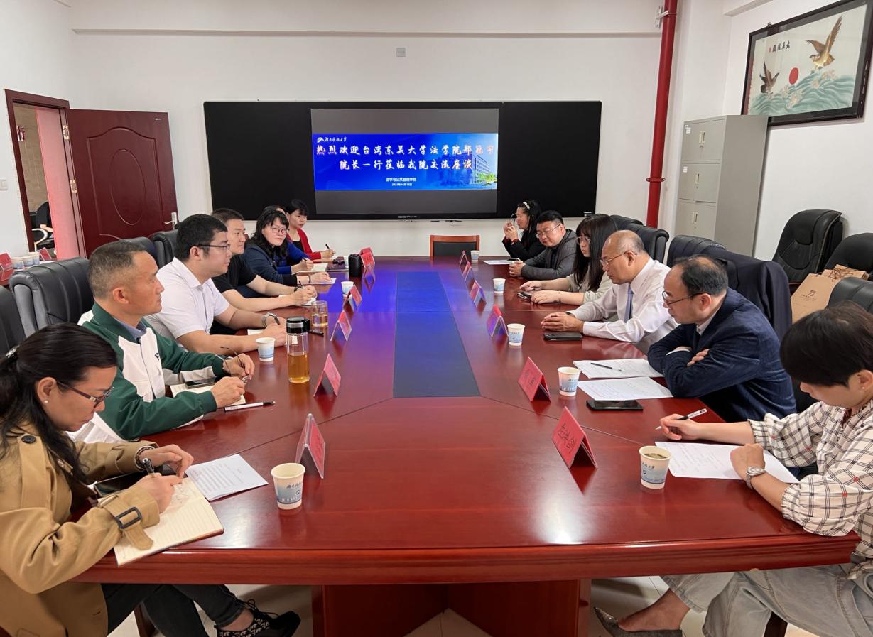 港澳台事务办公室龙潇副主任介绍了我校与台湾高校学术交流与合作的有关情况。其后郑冠宇教授结合东吴大学法学院的办学特色以及培养方式对法学学科的建设经验进行了分享,双方就法学专业教学和人才培养方面的一些问题进行了交流并互换意见,并表示希望将来能有机会建立两校之间的交流合作。