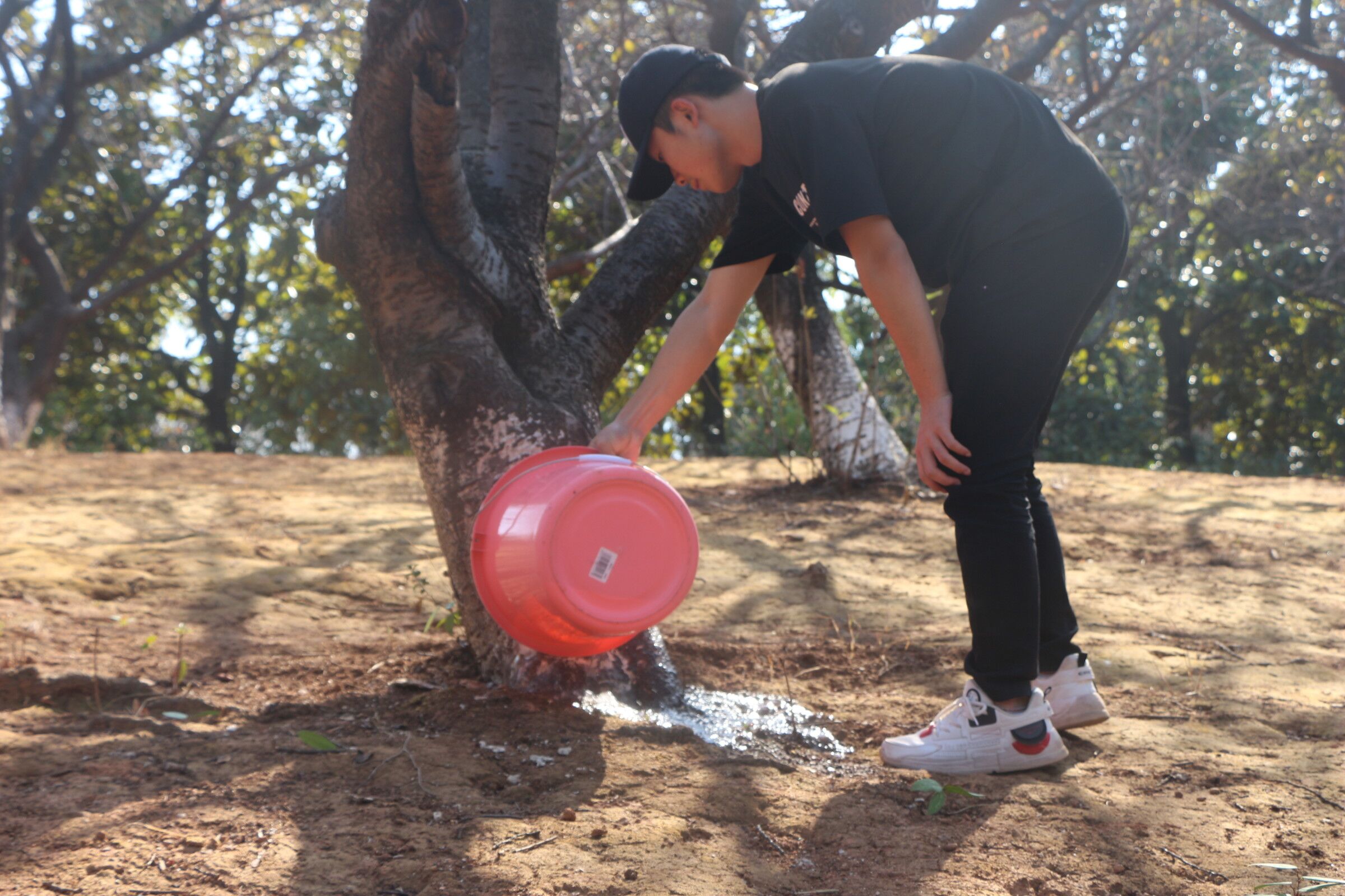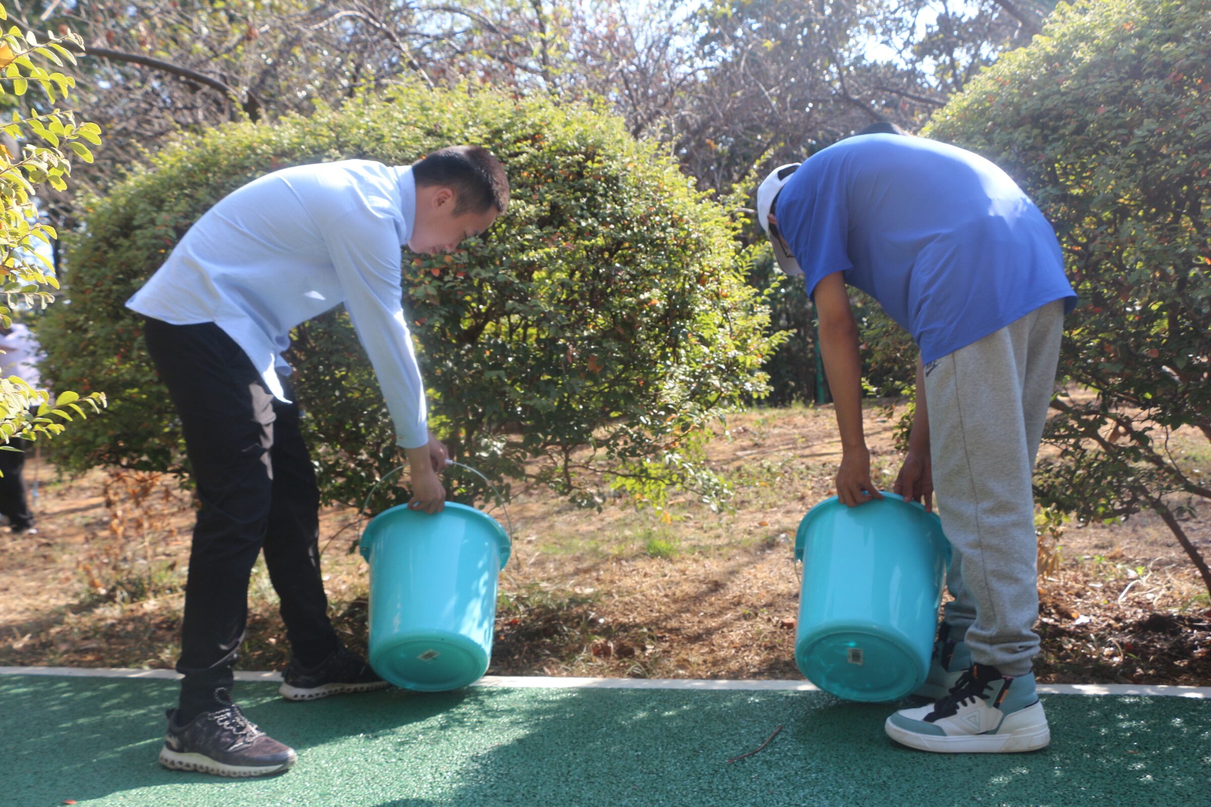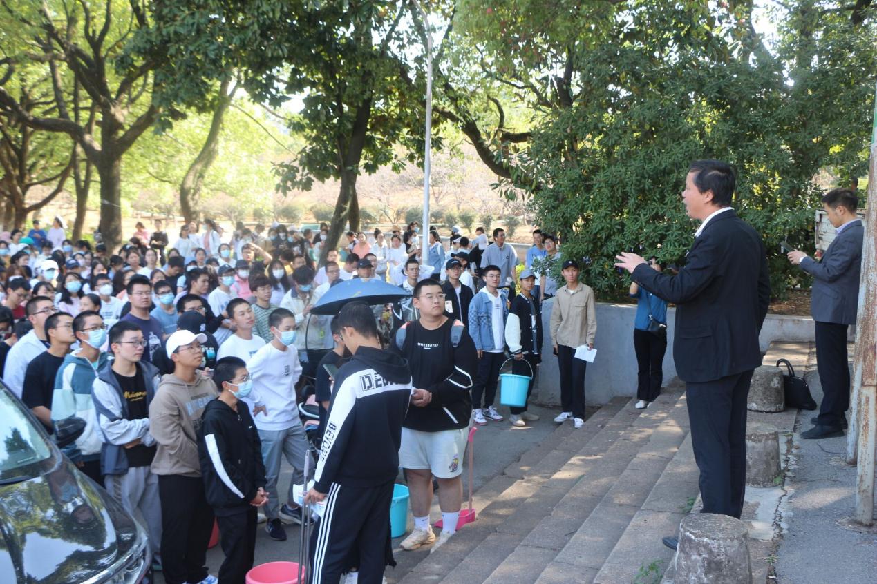 党委副书记叶军对此次实践活动各年级的任务做出说明。其后,随着叶书记一声令下,各班学生闻声而动,迅速投入到劳动之中,开始了热火朝天的实践活动。同学们大致分成两批,一批在洒水车旁有序排队接水为浇树做准备,另一批用提前准备好的扫帚、簸箕和垃圾袋打扫路上及草丛中的垃圾。浇树的同学们化身“护树使者”,一手环抱着装满水的盆子,另一手则舀盆中水浇向树,在水的滋润下,原本灰沉沉的树叶以肉眼可见的速度变得油亮,焕发出勃勃生机;负责拾捡白色垃圾的同学们则不顾累,不管脏,使出自己火眼金睛的技能,不放过任何一处地方、任何一点垃圾,让草地成为一片纯粹的绿。