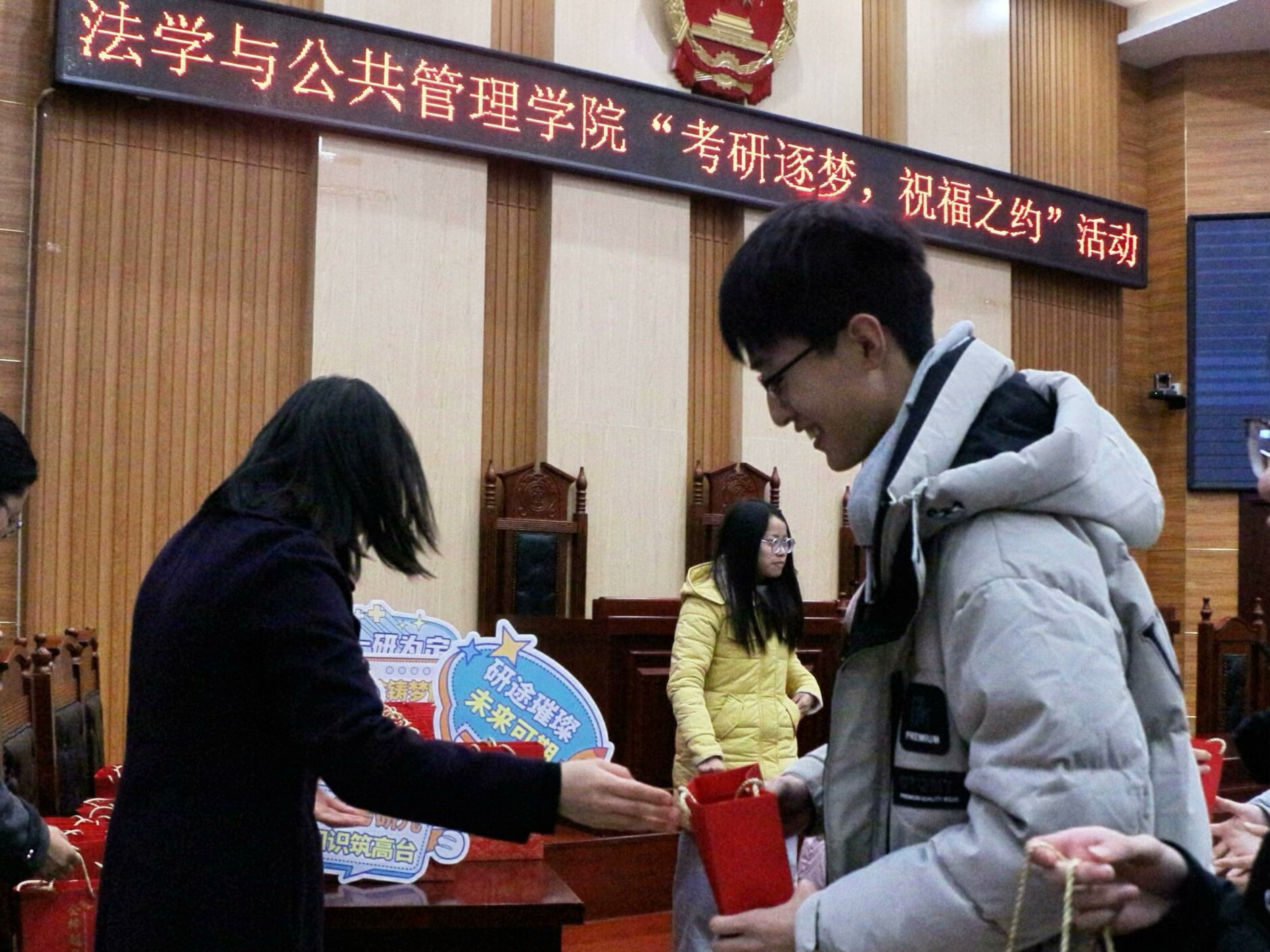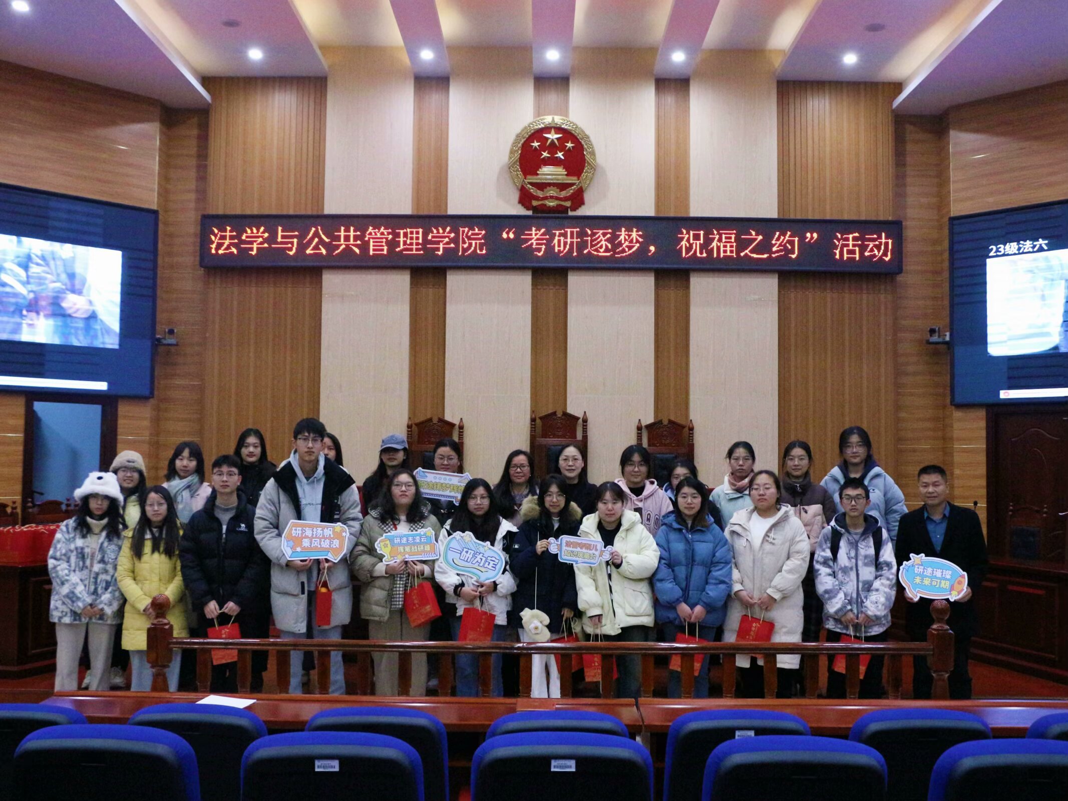 于立言楼3-2模拟法庭举办“考研逐梦·祝福之约”活动,21级考研学子到场参会。色情动漫