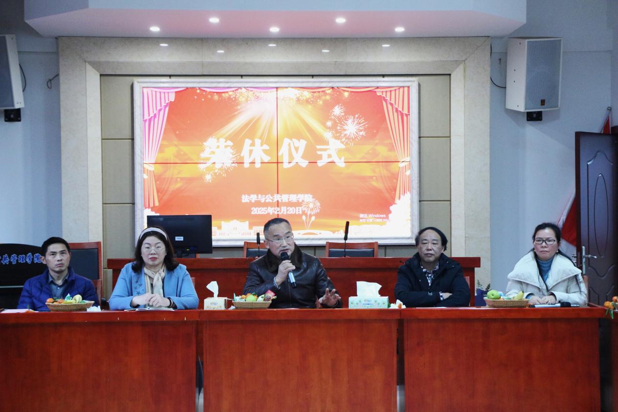 仪式开始,郑海祥书记发表了致辞。他深情回顾了徐德刚教授自投身教育事业以来的光辉历程,并对徐教授多年来的辛勤付出和卓越贡献表达了诚挚感谢。在仪式的特别环节中,学院精心制作的短片缓缓播放,带领大家回溯徐德刚教授的教育生涯。从初登讲台的风华正茂到成为学院的学术与领导骨干,从青涩的教育新手到逐步成长为引领法学信仰的资深学者,他始终坚守在教育一线,不仅在知识传授上倾囊相授,更在精神层面激励着一届又一届学生和青年教师不断进取。