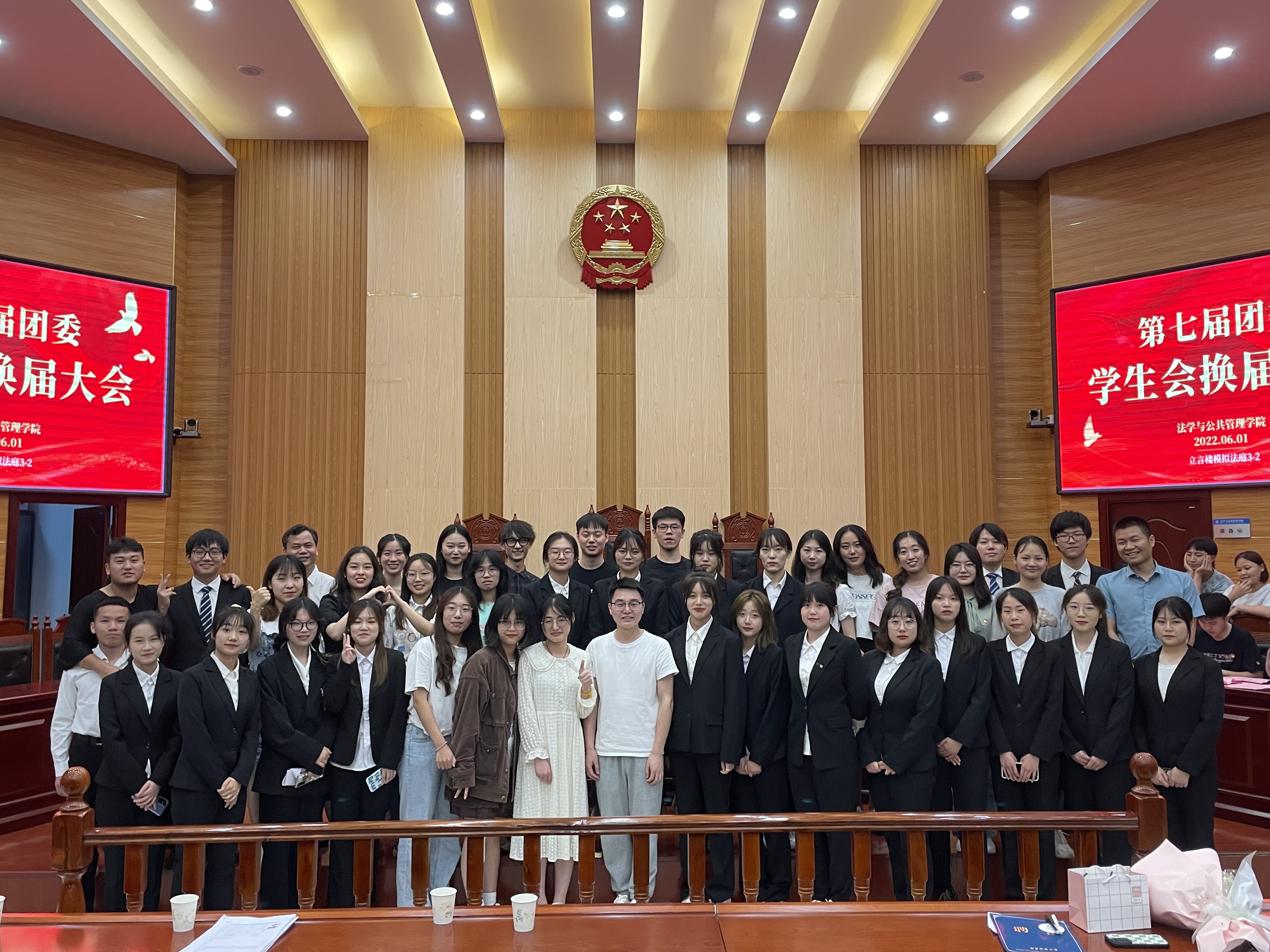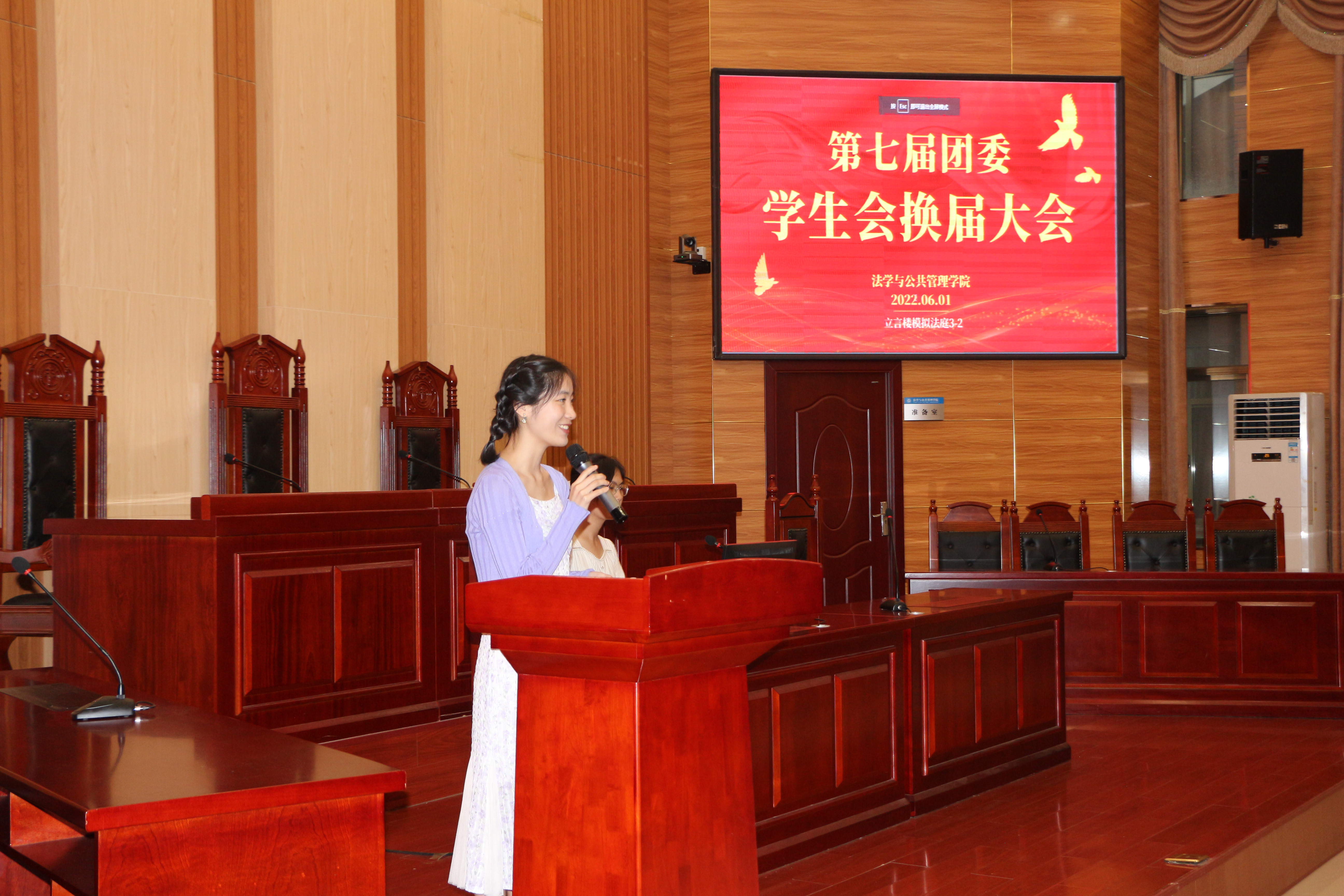 在立言楼3-2模拟法庭举行了第七届团委学生会换届大会。出席本次会议的有学院党委副书记叶军、学工办副主任郭志军、辅导员李斌、第六届团委学生会主要干部、学院19-21级各班学生代表。本次会议由第六届团委学生会团委第一副书记戴钰莹主持。
