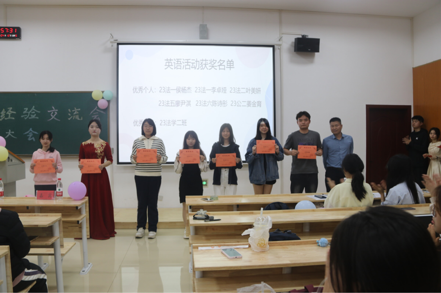 学风建设月英语活动中的优秀个人和优秀集体进行了表彰,并由郭志军主任为他们颁奖,他们分别是23法一侯杨杰同学、23法一李卓娅同学、23法二叶美妍同学、23法五廖尹淇同学、23法六陈诗彤同学、23公二姜金育同学,23法学二班。