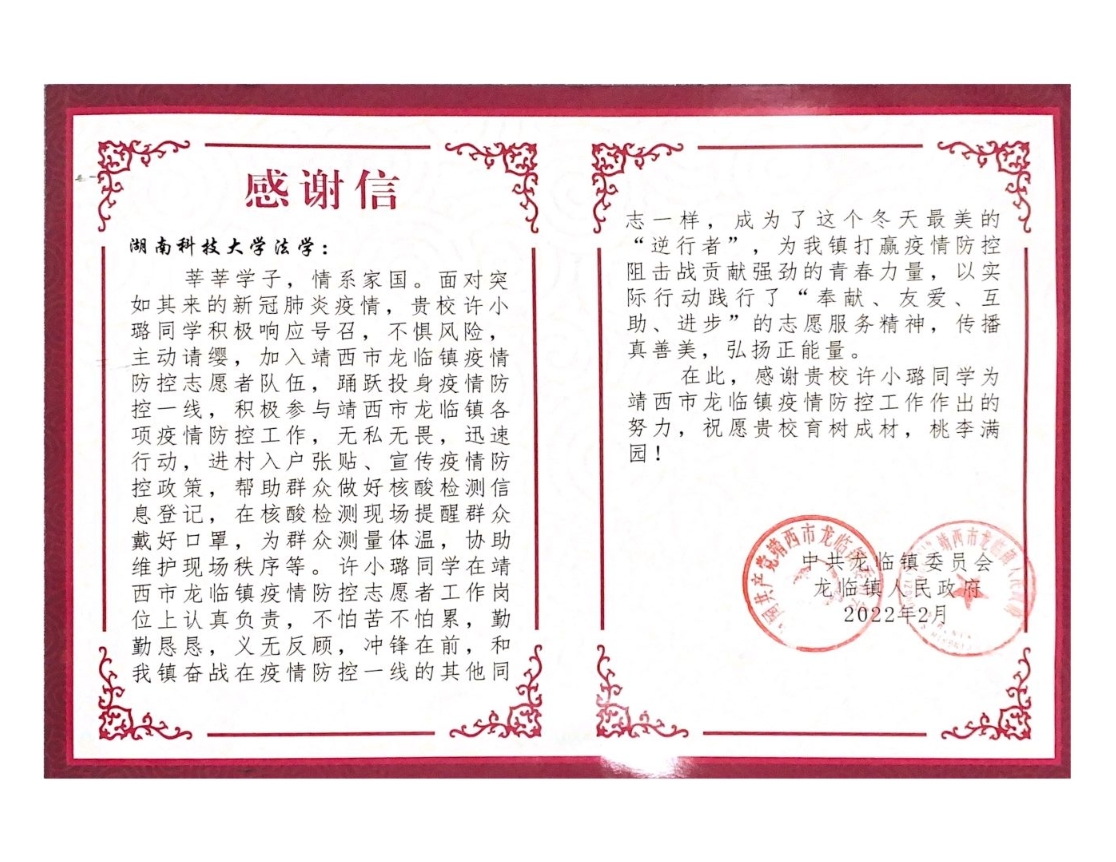 许小璐同学在此次春节期间主动请缨加入龙临镇防疫志愿者队伍,以及为疫情防控工作做出的努力贡献的感激之情。