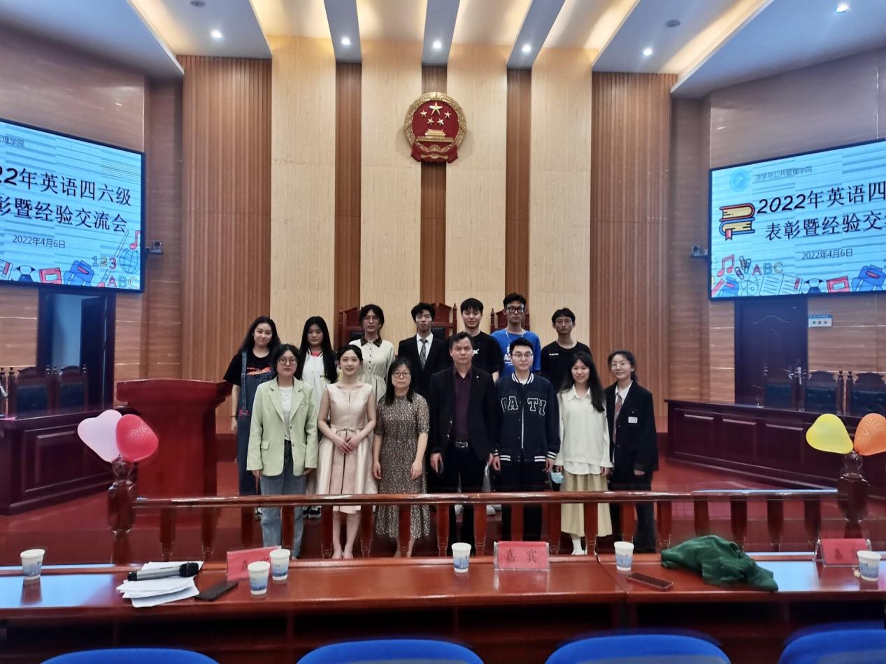 在立言楼模拟法庭举办了英语四六级总结表彰暨经验交流大会。学院党委副书记叶军、法学系主任吴四江老师、学工办主任朱荣老师和辅导员李斌老师到场指导,主席团成员、四六级高分学生代表与会,21级全体学生到场聆听。本次会议由学习部王之远、苏添羿同学主持。
