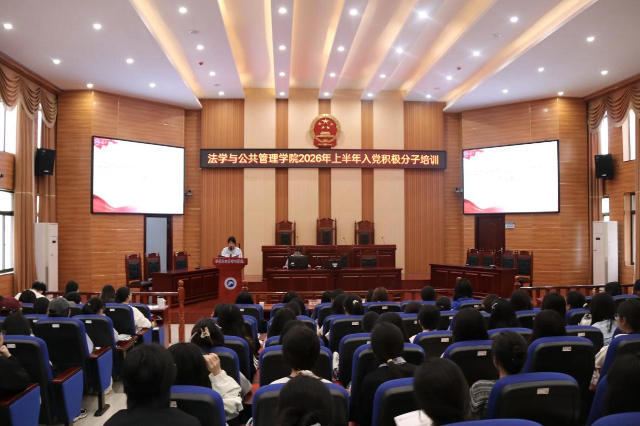 为引导入党积极分子树立正确的入党动机,增强党性修养,为党组织培育优秀的后备力量,4月18日,学院在立言楼3-2模拟法庭举行了培训班开班典礼暨首次专题党课,学院党委副书记范军豪、辅导员彭钰会出席活动,全体2026年上半年入党积极分子参与本次培训。