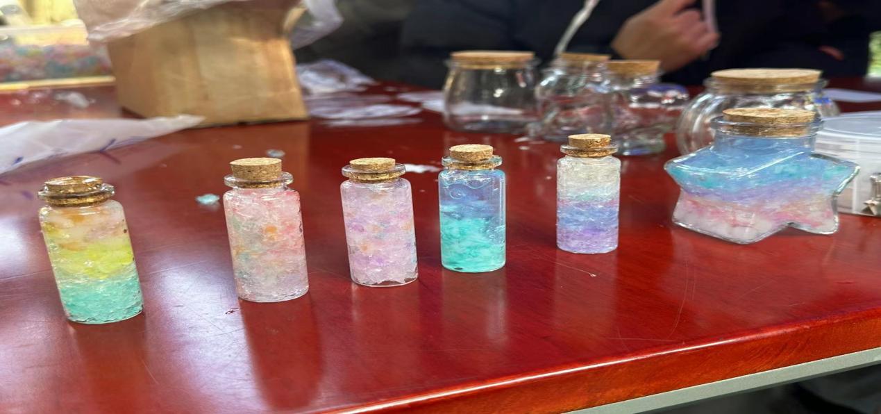 心健部成员提前准备好活动所需道具——海绵宝宝、玻璃瓶、水桶、针管等,并由心健部成员提前制作出彩虹瓶的样品供同学们参考。待一切准备就绪,活动正式开始,各学院学子积极参与,表现出极高的热情与兴趣,充分发挥自身想象力,制作出不少令人眼前一亮的作品。在创作彩虹瓶的整个过程中,同学们沉浸到手工制作之中,体会手工乐趣所在的同时释放压力,舒缓内心。活动结束后,同学们自行将装载着美好愿望的彩虹瓶带回寝室。