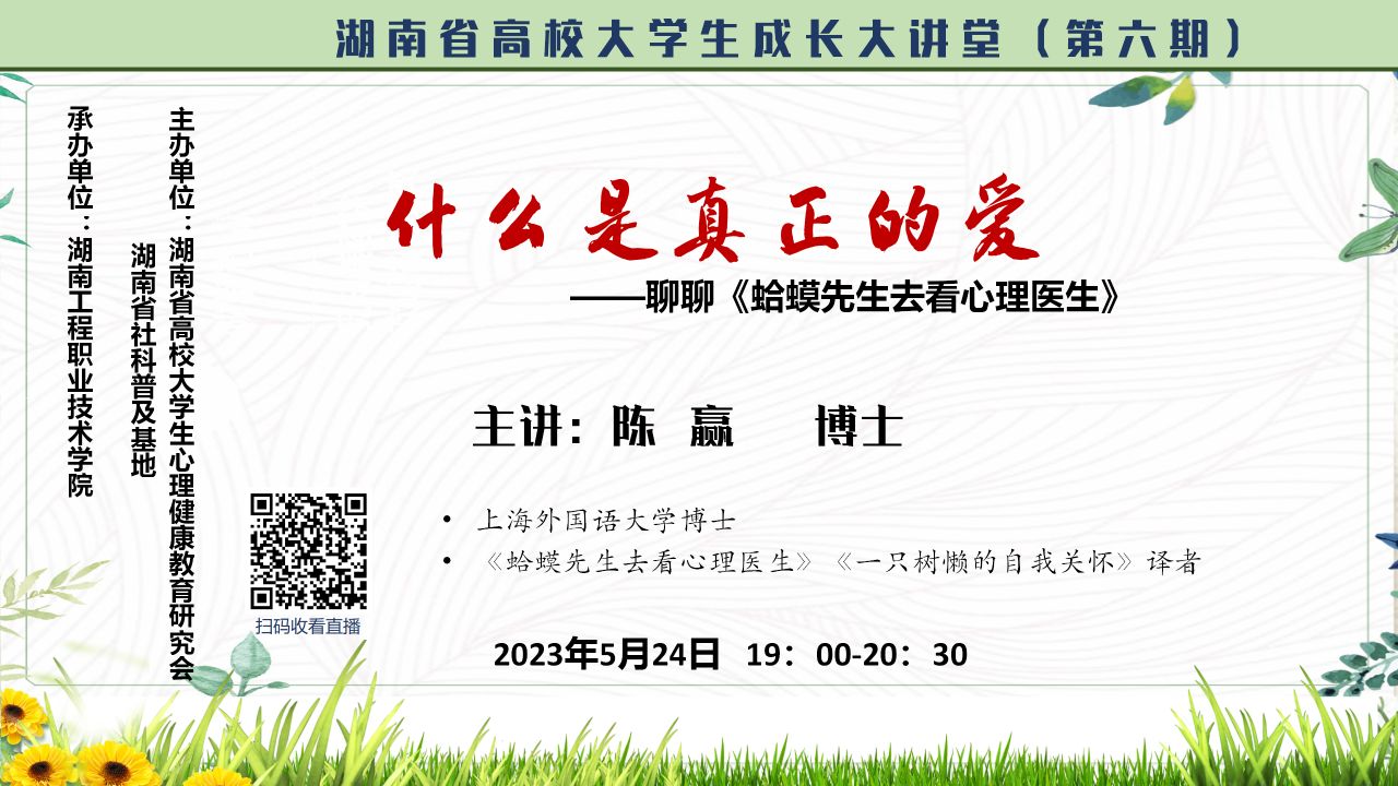 为了进一步做好大学生心理健康宣传普及教育,引导大学生勇敢探索自己的内心世界,我校特此组织全体大二学生于5月24日晚,观看“什么是真正的爱”为主题的线上直播讲座,本次讲座由《蛤蟆先生去看心理医生》的中文译者陈赢博士主讲。色情动漫