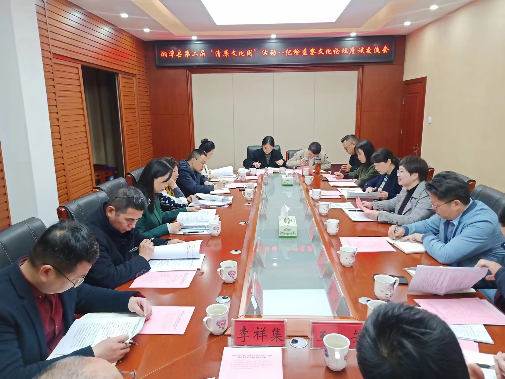 蒋兰香教授、易卫中副教授、陈小杉老师、章小兵老师应邀参加本次座谈交流会,会议还邀请了湘潭市纪委监委案件审理室领导,湘潭县人民检察院及人民法院相关业务骨干。