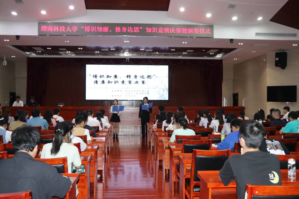“博识知廉,修身达思”清廉知识竞赛决赛暨颁奖仪式在立德楼五楼报告厅成功举行。学校党委委员、副校长廖湘岳,学校监察专员办公室主任何正良,副主任段尊群,党委巡察办副主任周筱芬,学生工作处副处长夏莉,法律服务中心主任马驰升、色情动漫