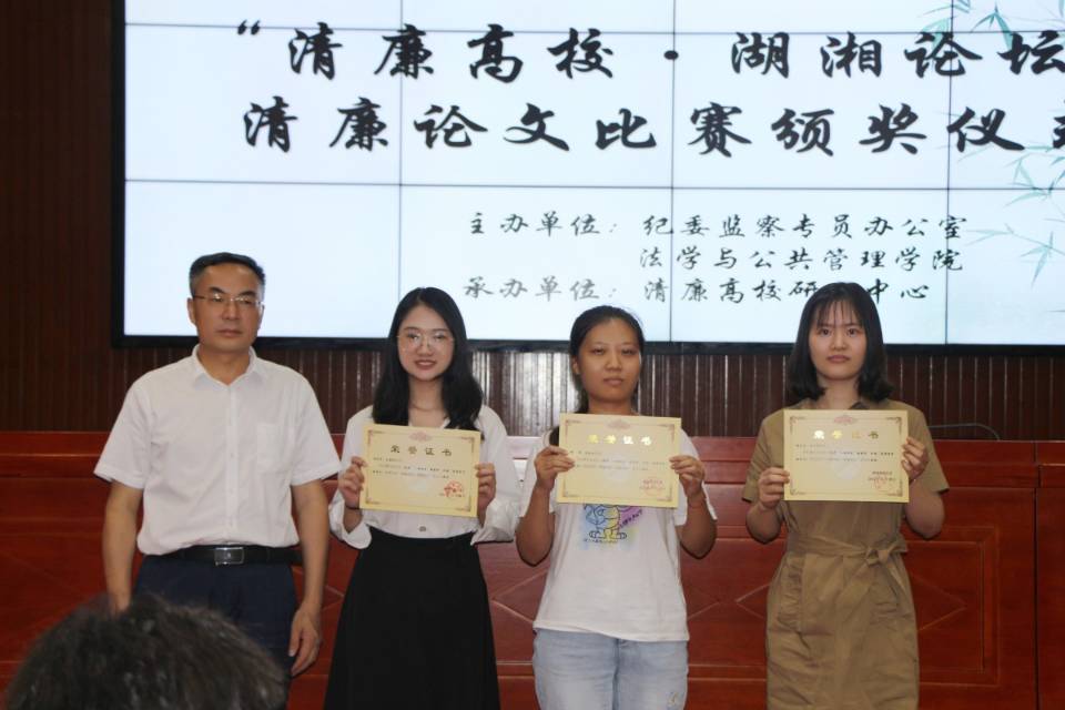 紧接着,主持人宣布“清廉立德行,乾坤藏笔下”征文比赛和“清廉高校·湖湘论坛”论文比赛获奖名单,由校领导颁奖并合影留念。