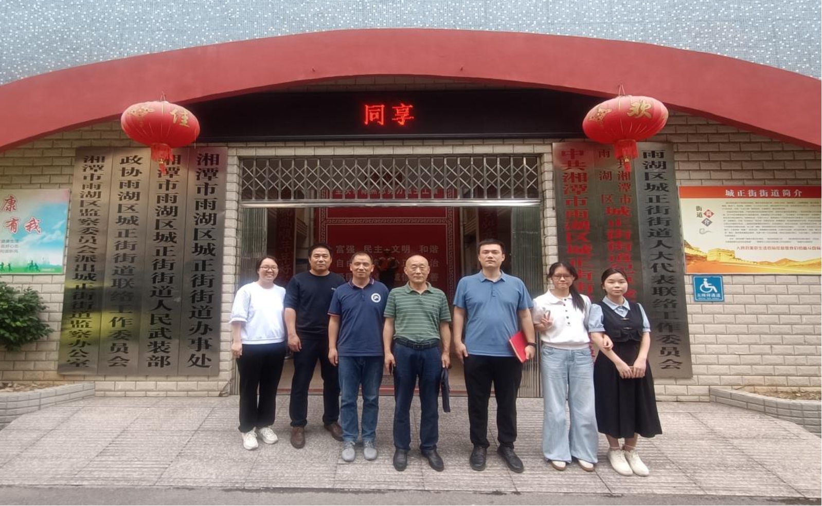 ▲检查小组成员与实习学生在雨湖区城正街街道办门口合影