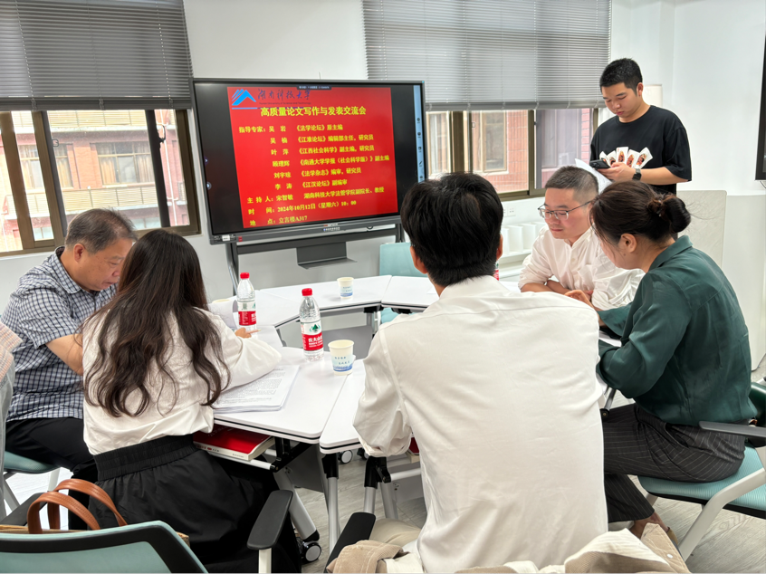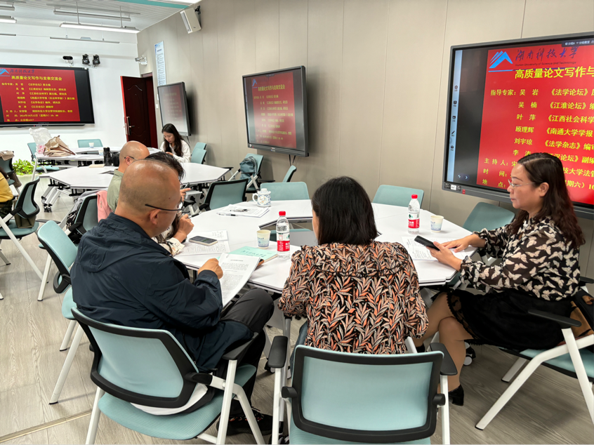 10月12日上午,高质量论文写作与发表交流会在我校立言楼A317顺利进行。本次交流会邀请了《法学论坛》原主编吴岩、《江淮论坛》编辑部主任,研究员吴楠、《江西社会科学》副主编,研究员叶萍、《南通大学学报(社会科学版)》副主编顾理辉、《法学杂志》编审,研究员刘宇琼和《江汉论坛》副编审李涛前来指导。会议由色情动漫
