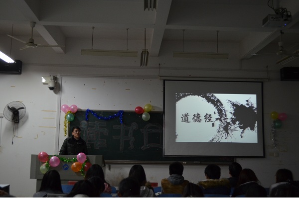 | “人生之乐不过于读一本好书,听一段好语”。12月17日晚七点,由毛泽东思想邓小平理论学习研究会主办的读书交流会在八教102教室拉开帷幕。出席此次活动的嘉宾有法学院思想政治教育系主任毛小平、毛研会指导老师杨盛军以及辅导员老师伍安、赵晗冰。 “经典著作是中华民族精神的源头,人类文化的瑰宝,开启大学生的心智,与其追捧时尚不如诵读经典。”来自13级思政一班的林豪庭用自己独特的见解来重温《道德经》。他从老子的出生传说讲到老子与道家文化,为大家讲述了关于“道”的内容。他说:“‘道’是中国乃至东方古代哲学的重要哲学范畴,是世间万物之母。遵循自然规律、清静无为、返璞归真才是至高无上的境界。”此外,林豪庭同学还选取《道德经》中的一章节《上善若水》供大家品味,针对“夫唯不争,故无忧”,他提出:“现在的人过于贪婪,为了获得利益不择手段,而道家的‘不争’正是我们所缺失的东西。” 而来自13级思政二班的姚逸飞同学则为大家讲述“重走红军长征路”,除了讲述红军长征的原因与过程、遵义会议等耳熟能详的故事,还有鲜为人知的会宁会师、腊子口战役。最后,他表示:“首先,作为当代大学生不能忘记历史,忘却就意味着背叛;其次,大学生做人做事一定要踏实,要实事求是。” 会后,毛小平老师总结道:“大学生要学会对人生、对社会进行思考,多读书,读好书,从而提升自己的修养。”同时,毛老师也提议读书交流加强互动环节,可以围绕一本书或一个话题进行深入的探讨,祝愿毛研会的读书交流会能够越办越好。 (责任编辑:admin) |
