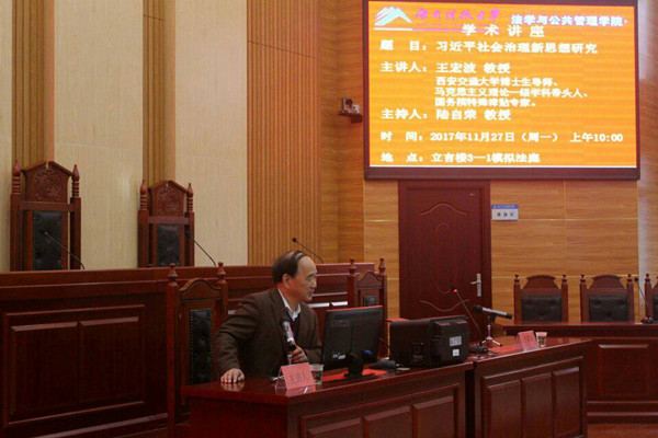 在立言楼3-2模拟法庭举行学术报告会,邀请西安交通大学博士生导师王宏波教授作了题为“习近平社会治理新思想研究”的报告。报告会由副院长陆自荣教授主持,宋智敏、袁玉明、徐金燕、王明、王慧慧、朱宇、罗珊、王球云等学院老师和100多名学生参加学习。 习近平治国理政思想是中国特色社会主义理论逻辑和实践逻辑的有机统一,是当代中国最鲜活的马克思主义。王教授围绕十九大报告专题的内容和精神,首先回顾了改革开放前后中国政府职能转变和社会管理变化的过程,系统阐述了社会治理形成和发展的历史必然性;接着以习近平关于中国特色社会主义社会治理思想为核心,分析了社会治理和社会管理的区别及其主要内容、特点、原则和方法;最后提出了在实现中华民族伟大复兴的中国梦征程中创新社会治理的七大任务,其中重点强调发展教育事业、完善住房保障、振兴乡村战略等改善民生领域的热点问题。 陆院长对报告进行了总结点评,指出王教授的讲座立足学科前沿,紧扣社会热点,内容全面具体,深入浅出,从社会治理视角探讨民生问题,拓展了师生研究和学习的视野;并结合法学和公管不同专业学生特点为其指明了努力学习的方向! (责任编辑:admin) |