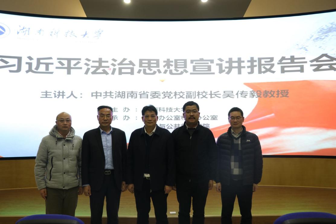2021年12月20日下午,我校在立志楼5-2多媒体中心主办了一场主题为“学习领会习近平法治思想”的宣讲报告会。报告会由中共湖南省委党校副校长吴传毅教授主讲,我校副校长廖湘岳教授主持,全校各学院老师、研究生和本科生代表200多人到场聆听学习。