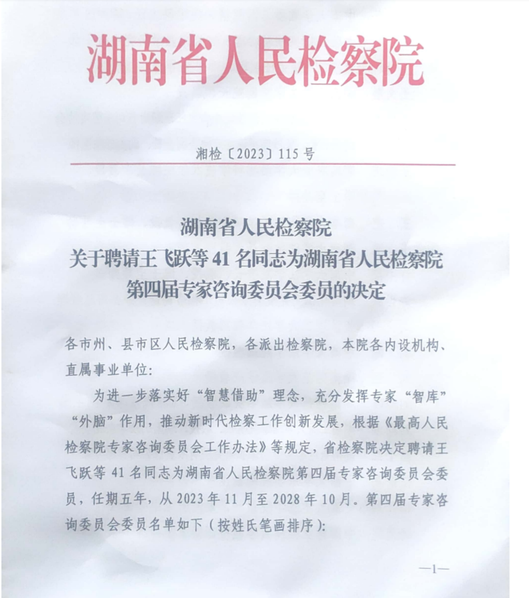 宋智敏教授和蒋兰香教授受聘为湖南省检察院专家咨询委员会委员