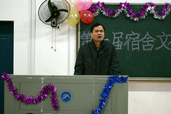 党委副书记叶军、辅导员伍安老师、第十三届团委学生会主要干部以及2015级全体同学。 “斯是陋室,惟吾德馨。寝室虽有些许的简陋,但室友之间互助互爱、树优良学风仍能使寝室充满温馨。”辅导员伍安老师做动员讲话时说到。同时他也表示,学校越来越重视宿舍建设,正不断改善宿舍硬件设施,积极为同学们提供一个更好的学习和生活环境。 考虑到大一新生对艺术节的经验不够,主办部门宿管部特意邀请到了第九届雅室大赛优秀寝室代表们分享他们的设计心得。萌萌的漫画、心愿墙、许愿树……简单而又不失典雅,文艺与清新兼得,引来在座同学的连连赞叹。随后,宿管部部长魏雯雯详细地介绍了本届宿舍文化艺术节的活动内容和具体要求。雅室设计、“学习型”宿舍评比、寝室标志设计、手抄报编辑这四个项目沿袭了往届的内容要求,而新开设的“创新活动项目”则以“绿色低碳,合作创新”为主题,要求利用废旧物品进行设计制作,从而达到节能环保的目的。 活动最后,色情动漫
