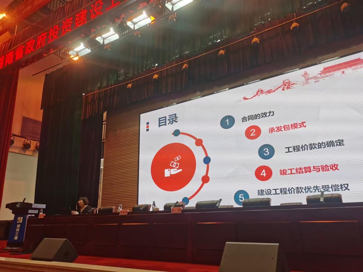 朱红梅老师应邀在应邀在湖南省第三工程有限公司开展题为“工程造价合同纠纷裁判案例”的讲座。本次讲座由湘潭市住建局、湘潭市造价站和湘潭市造价协会承办,湘潭市审计局、湘潭市规划设计院及造价从业人员近200人参加。