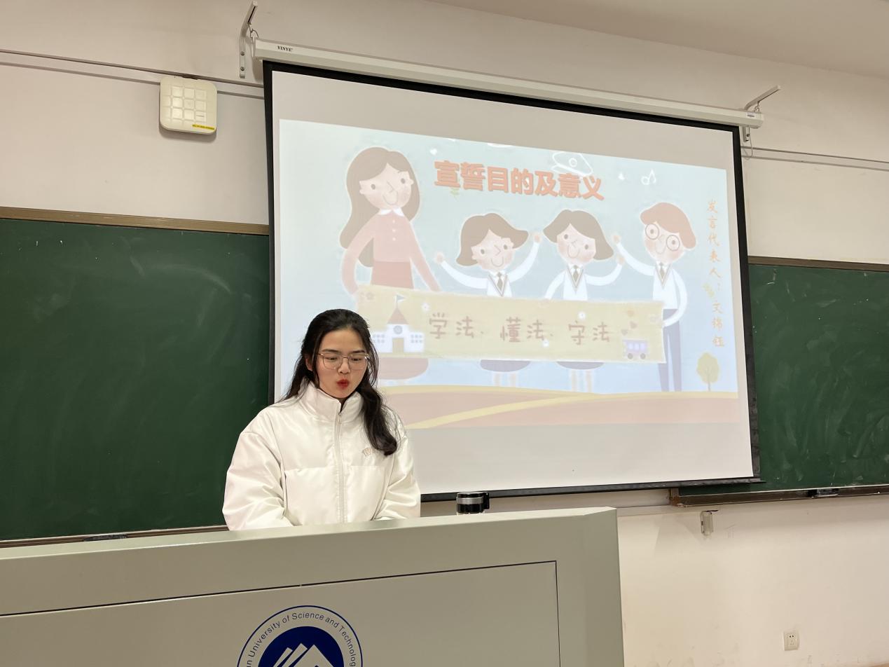 宣誓结束,法学四班文锦钰代表全体同学发言,她认为,本次模拟宪法宣誓活动有助于传递宪法精神,让宪法深入同学们的内心。并号召同学从身边的小事做起,从现在做起,成为宪法最坚定的弘扬者和践行者,让宪法精神代代相传、发扬光大!
