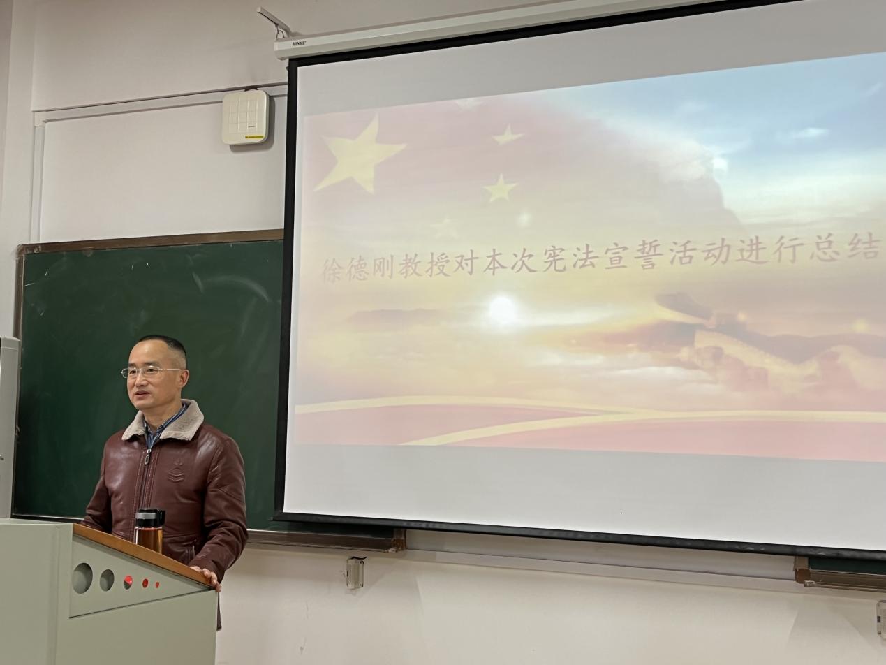 最后,监誓人徐德刚教授做总结发言。他充分肯定了同学们的热情与精心准备,再次阐述了本次模拟宪法宣誓活动的意义,并勉励全体同学:“宪法宣誓是各级人大及县级以上各级人大常委会选举或者决定任命的国家工作人员,以及各级人民政府、人民法院、人民检察院任命的国家工作人员,在就职时公开进行的庄严仪式,有助于增强国家公职人员的神圣感、使命感。今天的宪法宣誓是一次模拟活动,希望各位同学能够脚踏实地学习,以后有机会参加真正的宪法宣誓,让法治之光更加闪耀!”