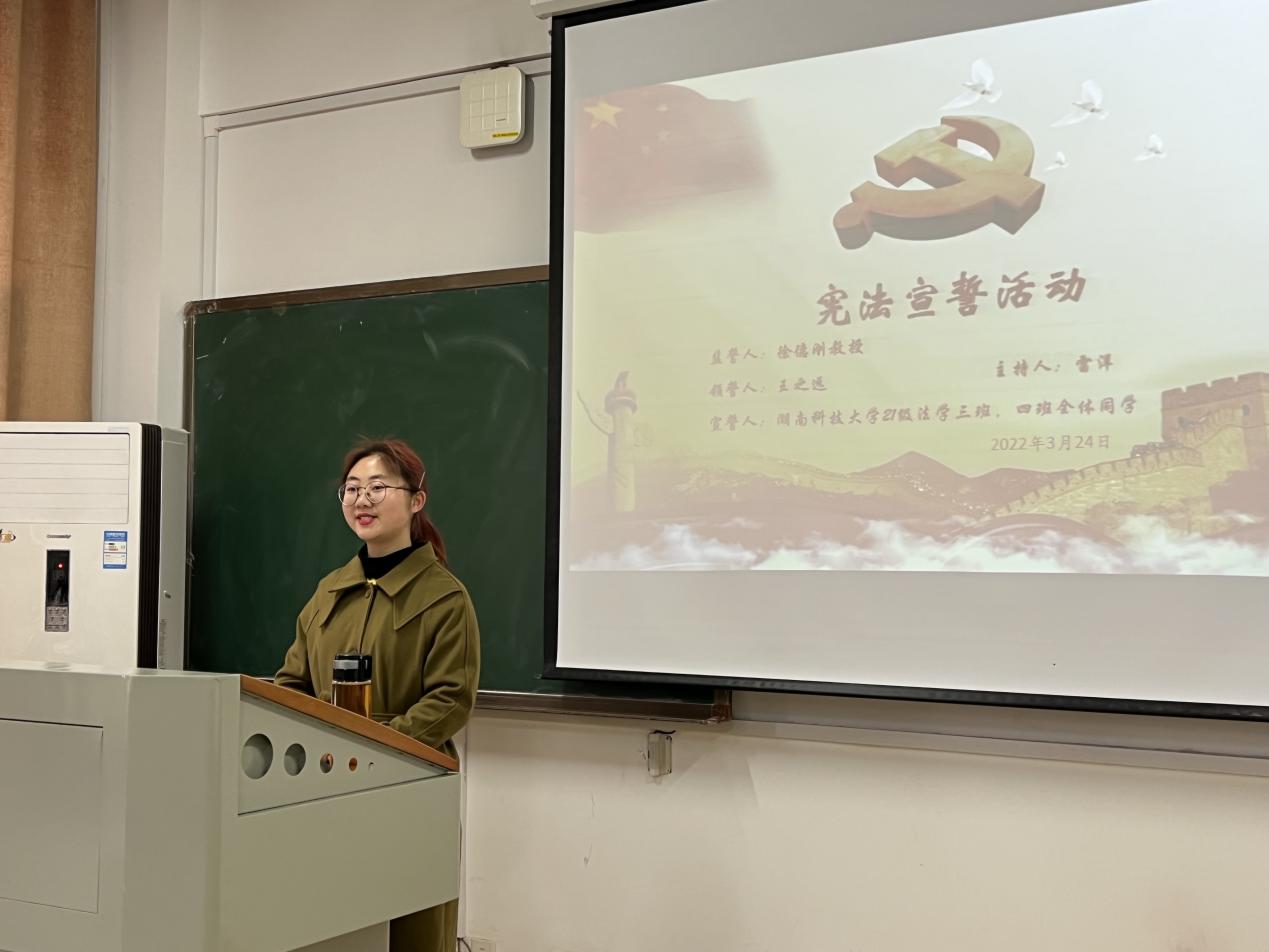 “知是行之始,行是知之成”,为了增强同学们的宪法意识,筑牢宪法信仰,自觉遵守、坚定捍卫宪法权威,大力弘扬宪法精神,实现宪法理论与实践的有机结合,3月24日上午,21级法学三、四班全体同学在立功楼B508举办了一次模拟宪法宣誓活动。活动由法学四班雷洋同学主持,《宪法学》主讲教师徐德刚教授监誓。