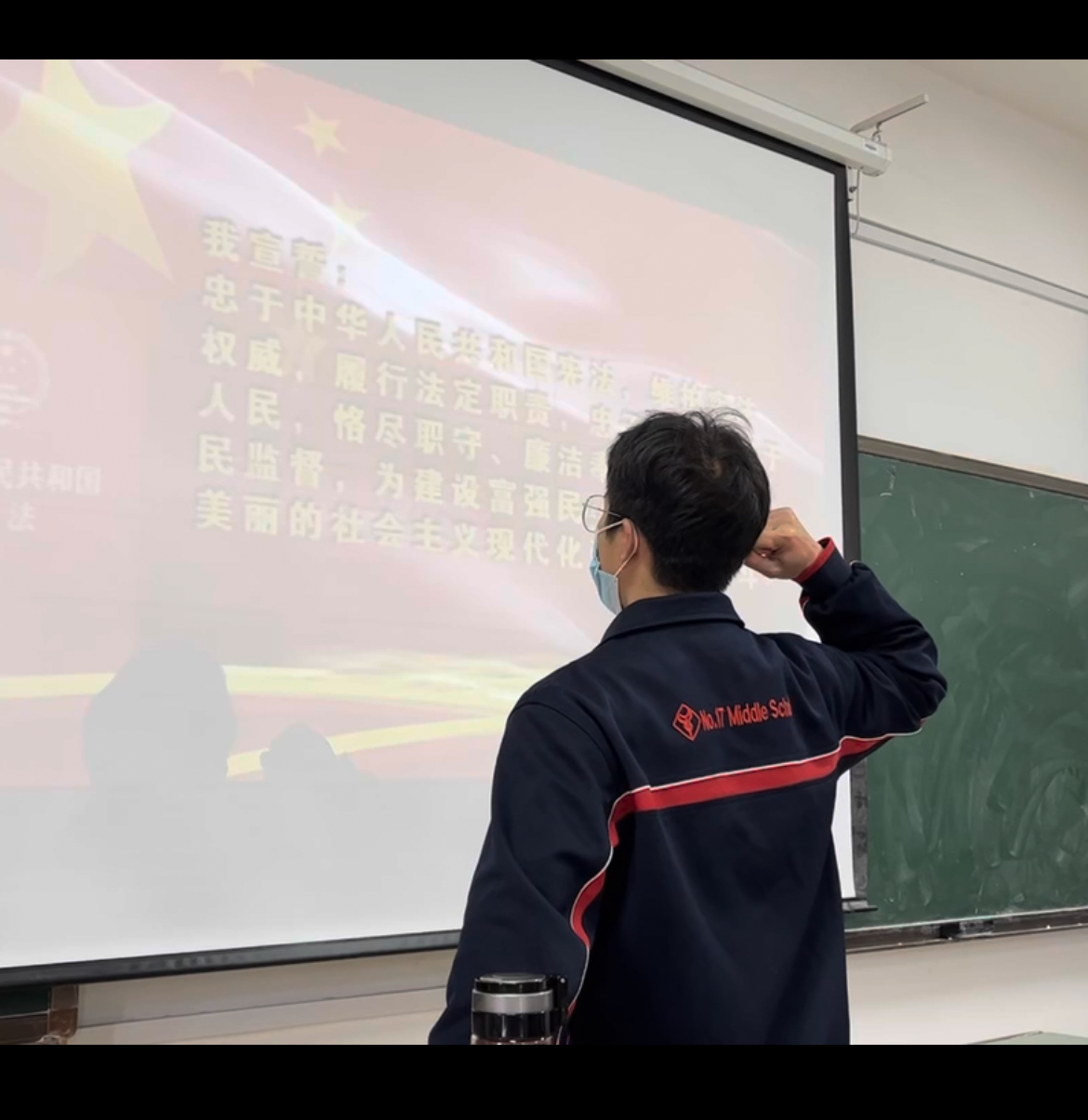 在嘹亮的国歌声中,模拟宪法宣誓活动正式开始。领誓人法学三班王之远同学,面向国旗,左手轻抚宪法,右手握拳举起,带领同学大声宣读誓词:“我宣誓:忠于中华人民共和国宪法,维护宪法权威,履行法定职责,忠于祖国、忠于人民,恪尽职守、廉洁奉公,接受人民监督,为建设富强民主文明和谐美丽的社会主义现代化强国努力奋斗!”