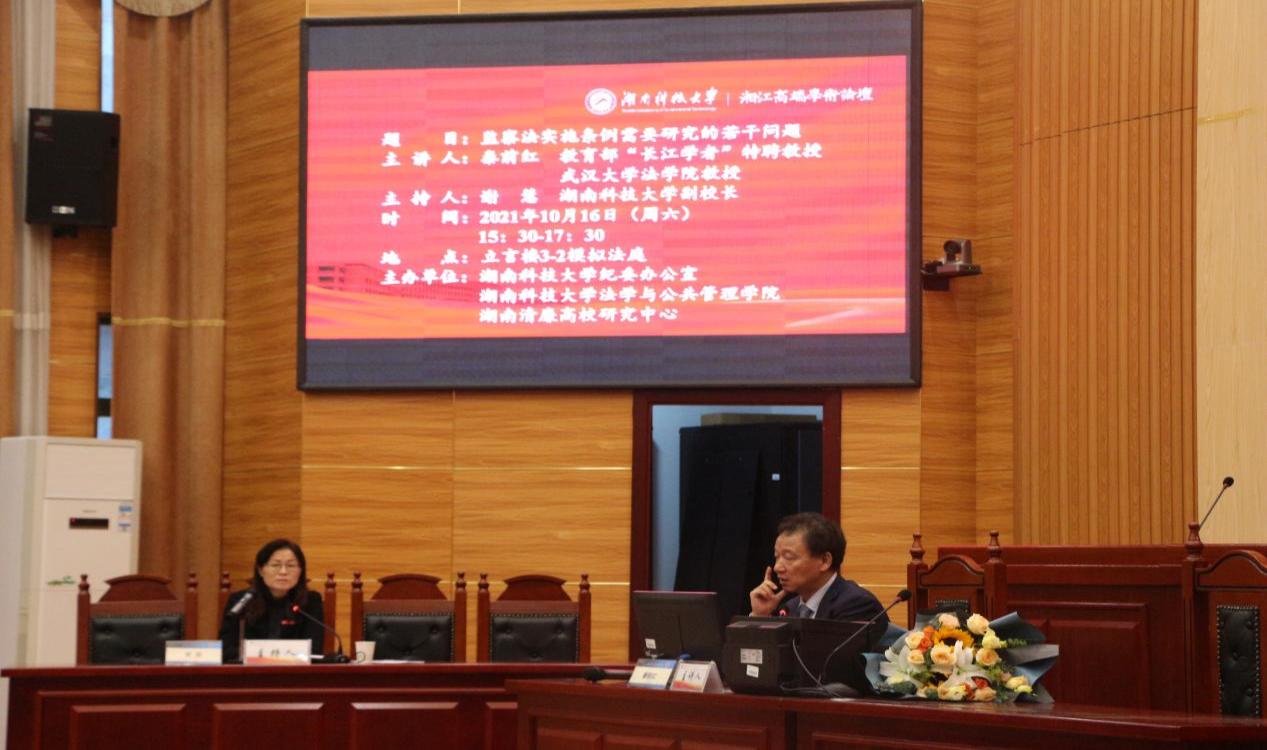 2021年10月16日下午,教育部“长江学者”,武汉大学博士生导师,《法学评论》主编秦前红教授应邀来我校开展了“监察法实施条例需要研究的若干问题”的专题讲座。本次讲座由我校谢慧副校长主持,校全体纪检监察委员、湖南清廉高校研究中心成员、色情动漫