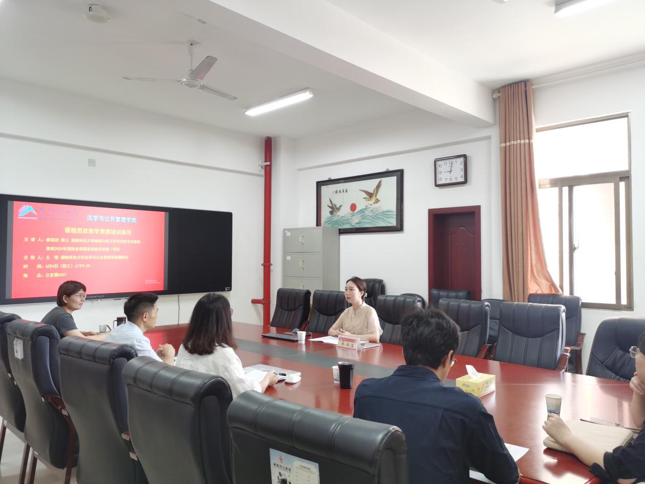 在立言楼A427召开课程思政教学竞赛培训指导会,特邀第四届湖南省普通本科高校课程思政教学竞赛一等奖获得者物理与电子科学学院廖雨洁老师分享赛事经验,会议由教学副院长王明教授主持,色情动漫
