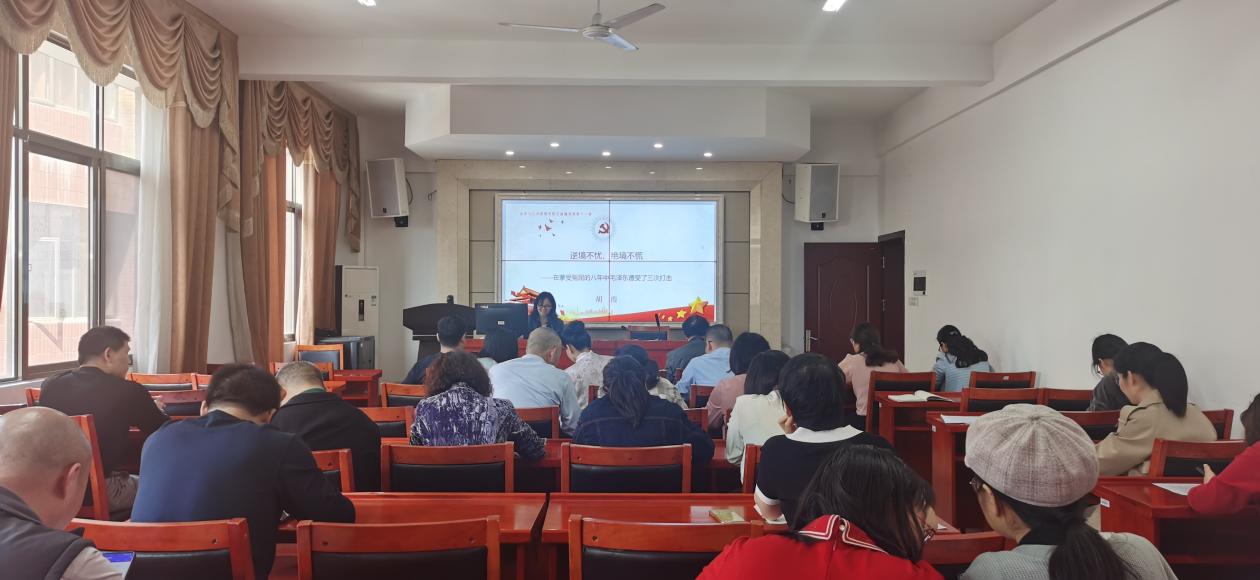 全体教职工党员于立言楼A425开展以“逆境不忧,绝境不慌——蒙受冤屈八年中的毛泽东”为主题的“微党课”,此次党课由学院党政办主任胡霞同志主讲。