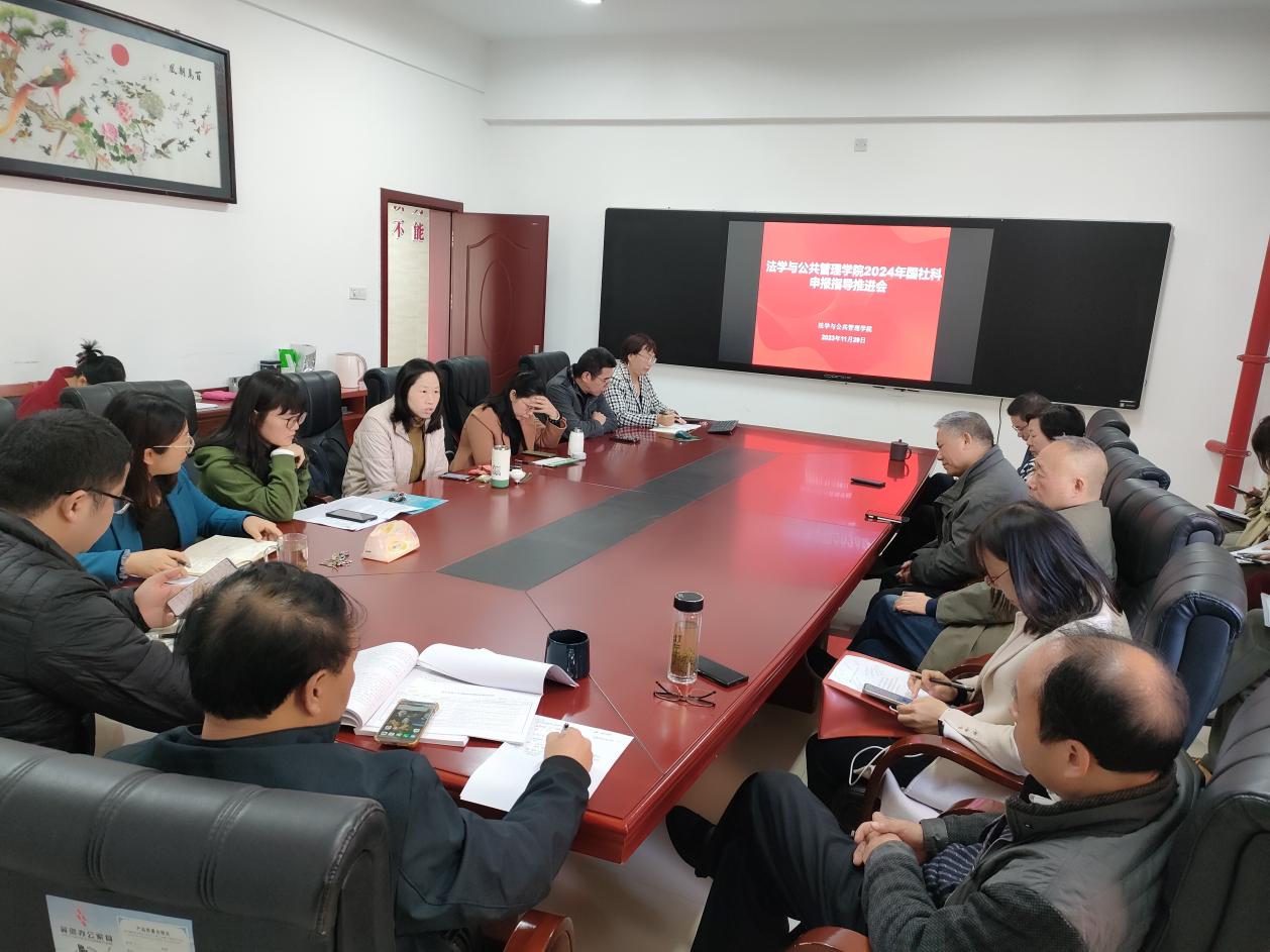 2024年度国家社科基金推进会在立言楼A427会议室召开。会议由副院长宋智敏教授主持,邱帅萍院长,郑海祥书记,蒋兰香教授,喻军教授,胡之芳教授,胡正昌教授,徐金燕副教授,吴四江副教授,王慧慧副教授,易卫中副教授,李倩副教授,雷连莉副教授,雷勇博士,陈浩博士,范晓韵博士,赵筱芳博士参加了会议。