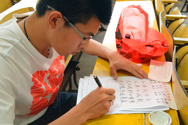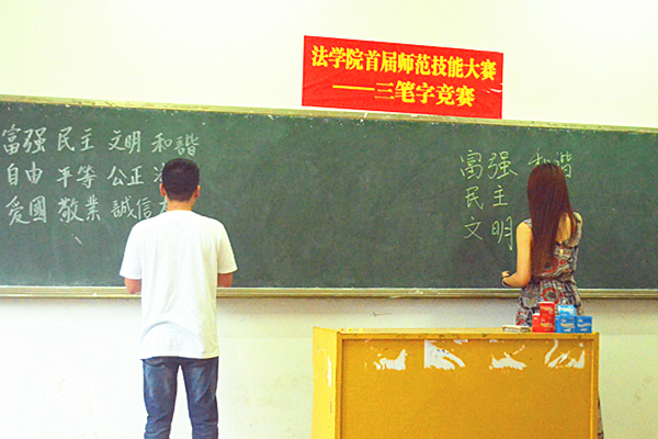 院长廖家林,副院长胡正昌、陆自荣,思想政治系系主任毛小平,哲学系系主任颜中军,思政系朱学恩、杨盛军老师莅临活动现场。 本次大赛的参赛选手由13-15级思政专业各班推荐,比赛项目分别是钢笔、粉笔和毛笔,以软硬笔为标准分别在两个教室同时进行。书写内容分为必写和任意两部分,形式灵活多样,内容生动。在他们上交的参赛作品中,既有恣情挥毫的毛笔字,也有行云流水般的行书,还有娟秀工整的楷书。比赛结束后,评委对他们的作品做出了公正的裁判,并对本次大赛给予了高度的评价。高松、甘恒业凭借其坚实的书法基础斩获了本次比赛的一等奖,另有14人荣获二等奖和三等奖。 此次师范生书法比赛的举办,让我们领略了思想政治教育系同学们的独特才情,给书法爱好者提供了一个展现才艺的平台,更对师范生书法技能的提高起到了很好的推动作用。在幽幽的墨香中,三笔字的决赛落下帷幕。 (责任编辑:admin) |