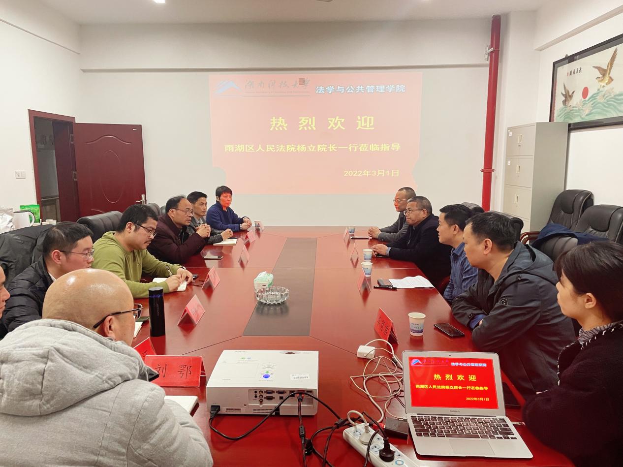 与湘潭市雨湖区人民法院的合作在大学生诉讼引导志愿活动、庭审进校园等方面取得了较大成功。为进一步深化院校合作,加强双方联系,2022年3月1日下午,雨湖区人民法院党组书记、院长杨立,副院长王德云,政治部主任方刚,执行局局长李育君,民二庭庭长暨立春等莅临色情动漫