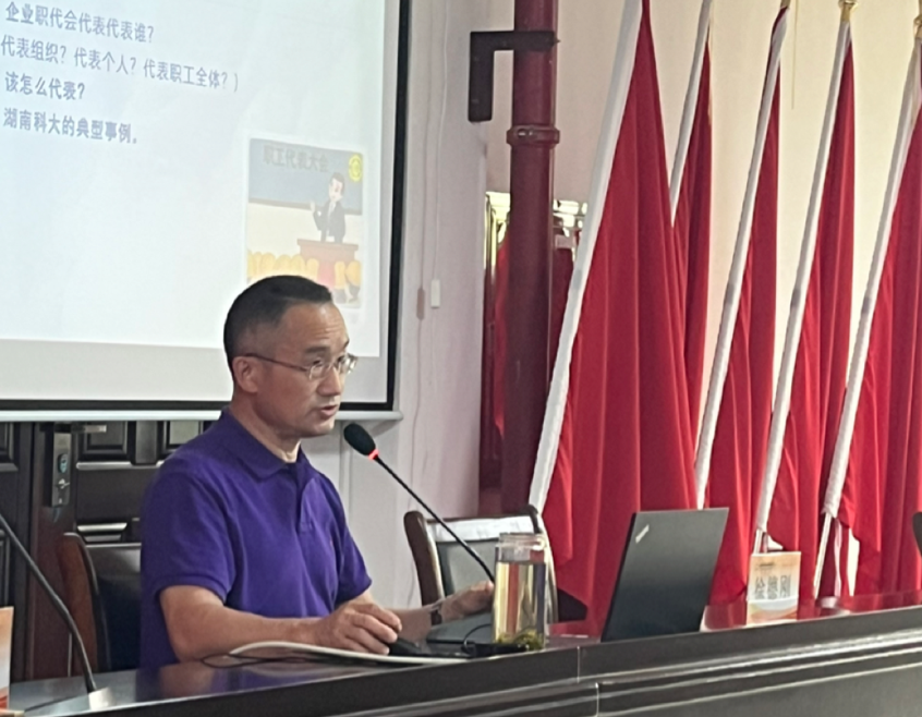 教授徐德刚受湖南胜利湘钢钢管有限公司邀请,为该公司中高层领导、工会主席、职工代表主讲了一场题为“新时代如何当好职工代表”的讲座。湘钢钢管公司总经理昌发祥、相关职能部门负责人和职工代表共计60余人与会。