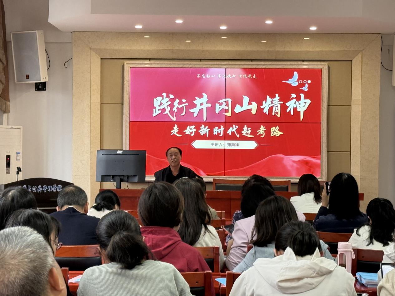 全体教职工在立言楼A425开展了以“践行井冈山精神 走好新时代赶考路”为主题的“微党课”。本次党课由学院党委书记郑海祥同志主讲,旨在引导教职工党员深刻领会井冈山精神的内涵与时代价值。