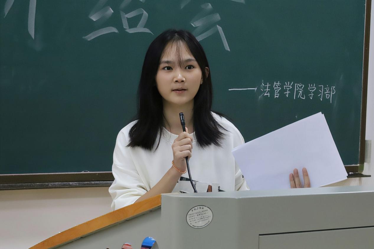 优秀学生代表陈嘉嘉提出应重视“首课效应”,借助教师、同学、网络课程与法考资料等多元渠道,构建独立的法律思维模式;刘颖渝则以"法学星河"为题,梳理出“课前搭框架—课中深理解—课后建体系”的学习路径,并向新生推荐专业数据库与经典书目,为同学们提供了清晰可循的学习策略。两位同学的分享不仅展现了法学学习的系统性与方法性,同时也为新生提供了实用的学习方法。
