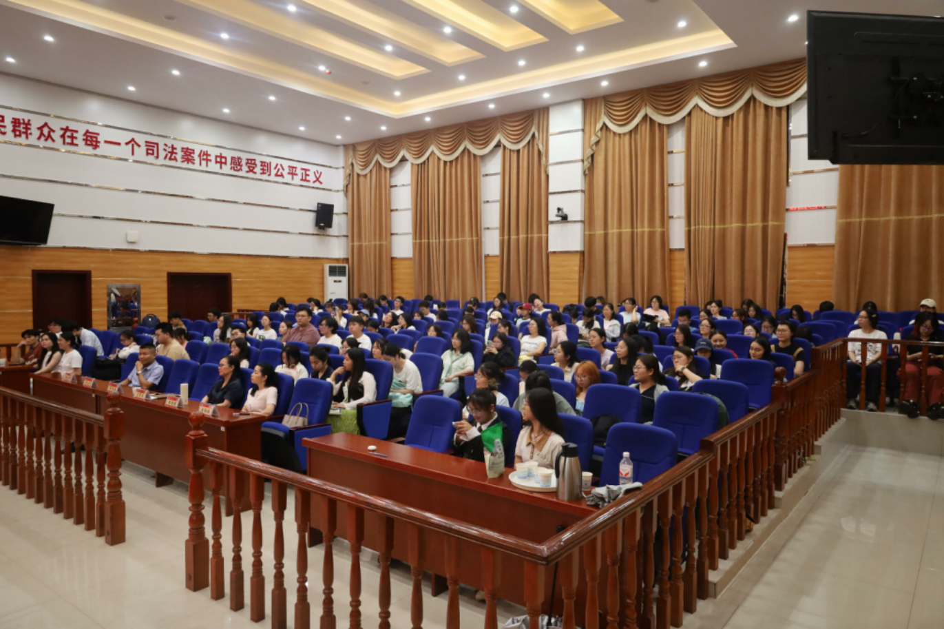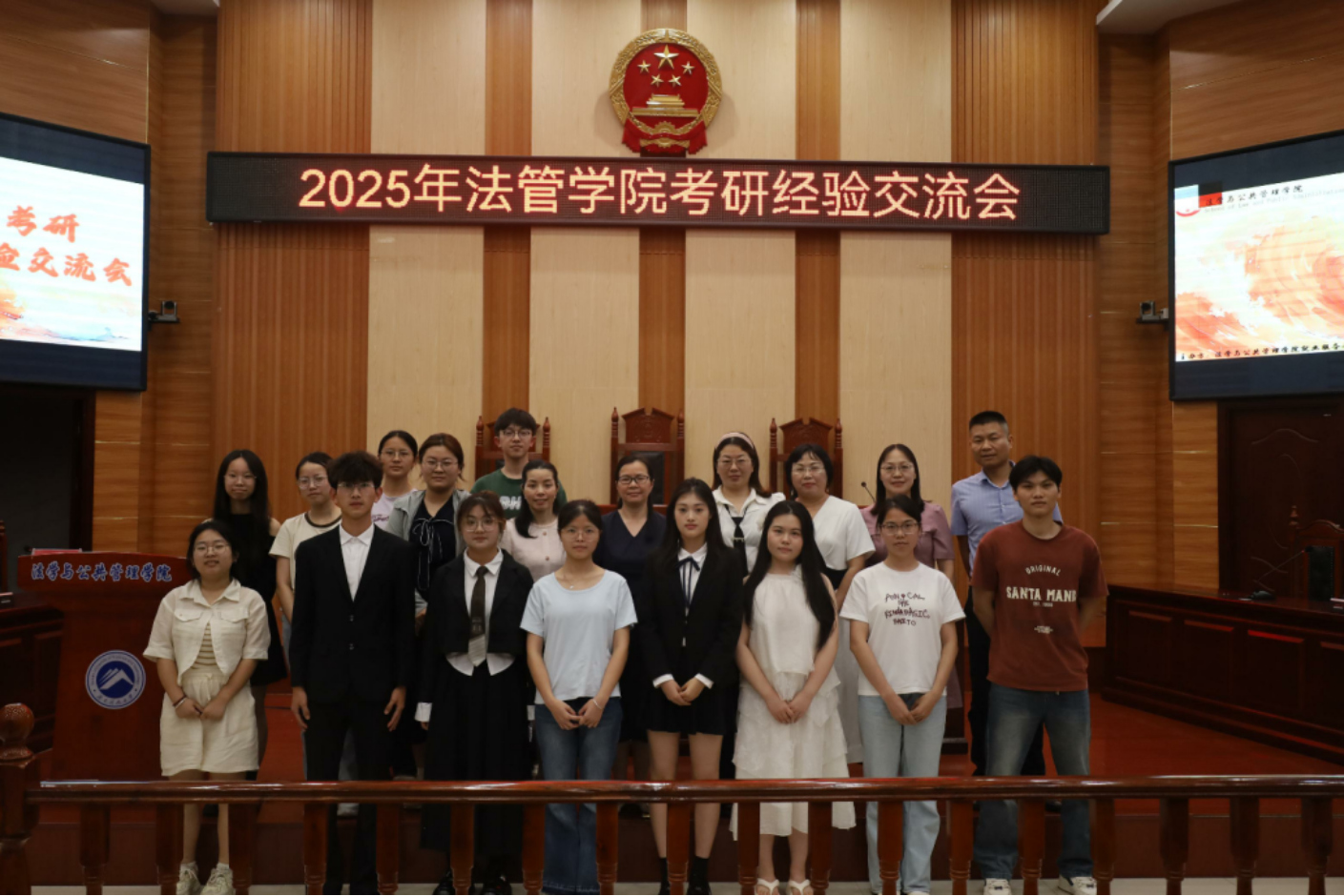 于模拟法庭举办考研经验分享会。学院特邀几位经验丰富的老师以及考研中取得优异成绩的学子,为大家分享宝贵的考研经验与学习方法。院党委副书记范军豪、学工办主任郭志军、教师朱红梅、雷连莉、徐金燕到场指导。